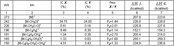 The heat of formation by molecule (ΔH) of cations resulted through fragmentation of two positions isomers, colons 6 and 7, were calculated by a Computational Quantum Chemistry method.
